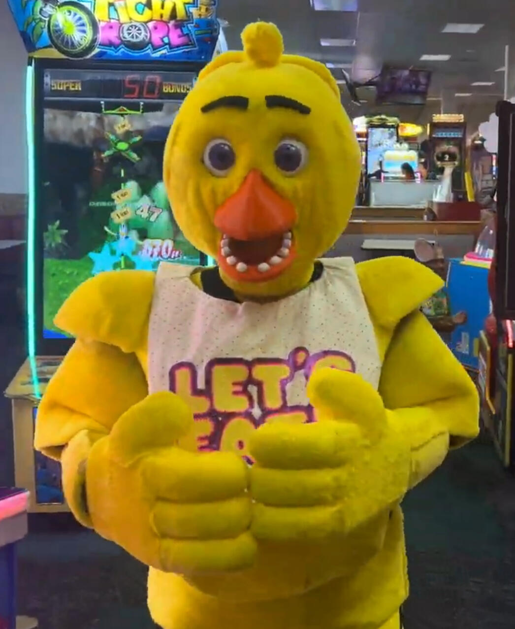 Chica the Chicken, the backup singer of the group, is extremely happy to be part of the Afton's Animatronics team! Though strange, she's also extremely kind and clumsy. Who knows what she'll be up to?